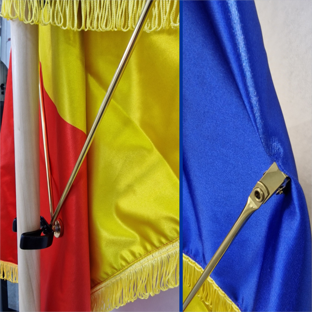 Drapel imprimat pe satin, extralucios, calitate exelenta, cu franjuri si ciucuri, recomandat pentru: ambasade, receptie hoteluri, birouri.