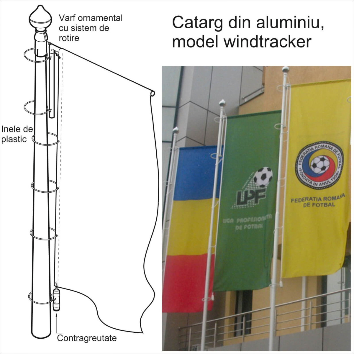 Drapelul este fixat de bratul metalic rotativ, care insa are posibilitatea de ridicare-coborare in lungul catargului.