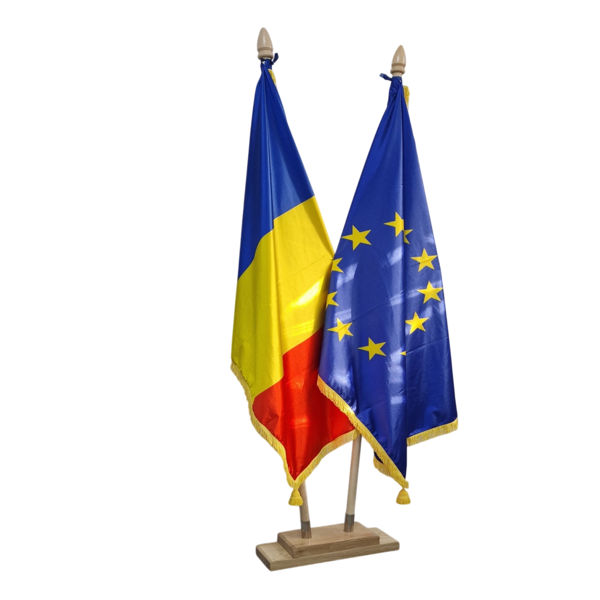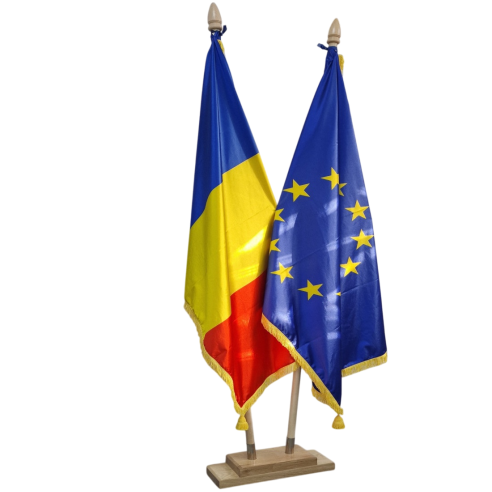 Kit dublu , complet pt arborare drapele Romania si UE , la interior, recomandat pentru institutii publice si companii