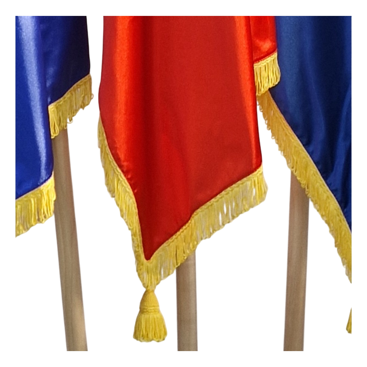 Drapelul este realizat din matase, material recunoscut pentru culorile sale deosebit de vii. Recomandat pentru interior, are brodat pe margini snur si ciucuri aurii. Poate fi instalat in sali de protocol, cladiri ambasade, sali sedinte sau conferinte etc.