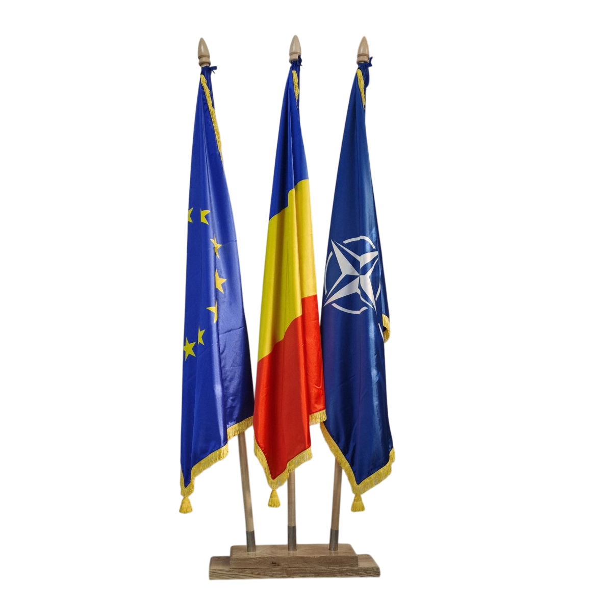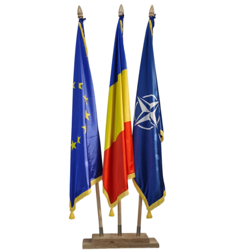 Kit complet pt arborare drapel Romania + UE + NATO la interior, recomandat pentru institutii publice si companii
