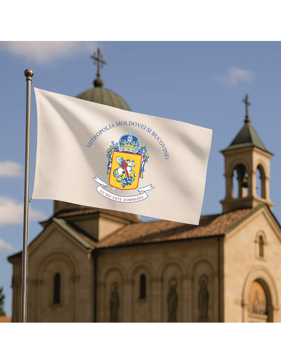Stema Mitropoliei Moldovei și Bucovinei, realizată în stil bisericesc tradițional. Utilizată în spații religioase și manifestări oficiale.