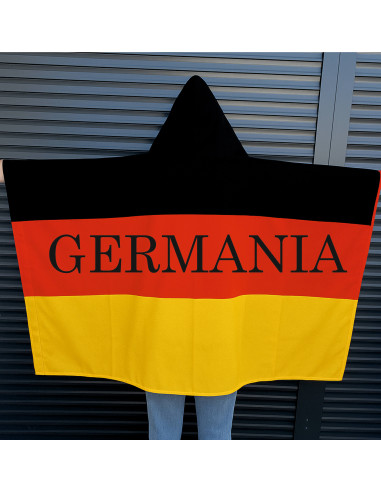 Pelerină cu glugă din material tip steag, perfectă pentru suporteri și evenimente. Poate fi personalizată la cerere cu orice design, devenind un accesoriu unic și memorabil.