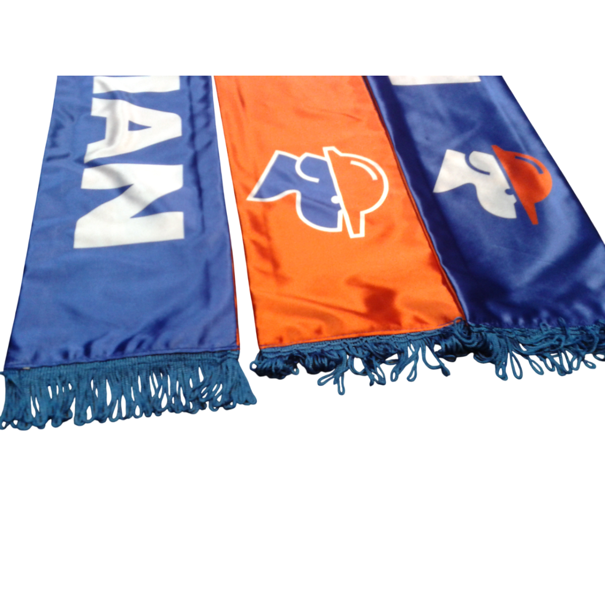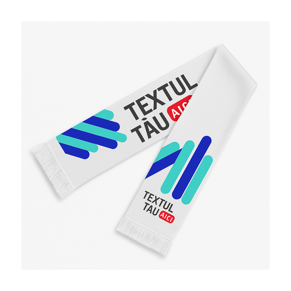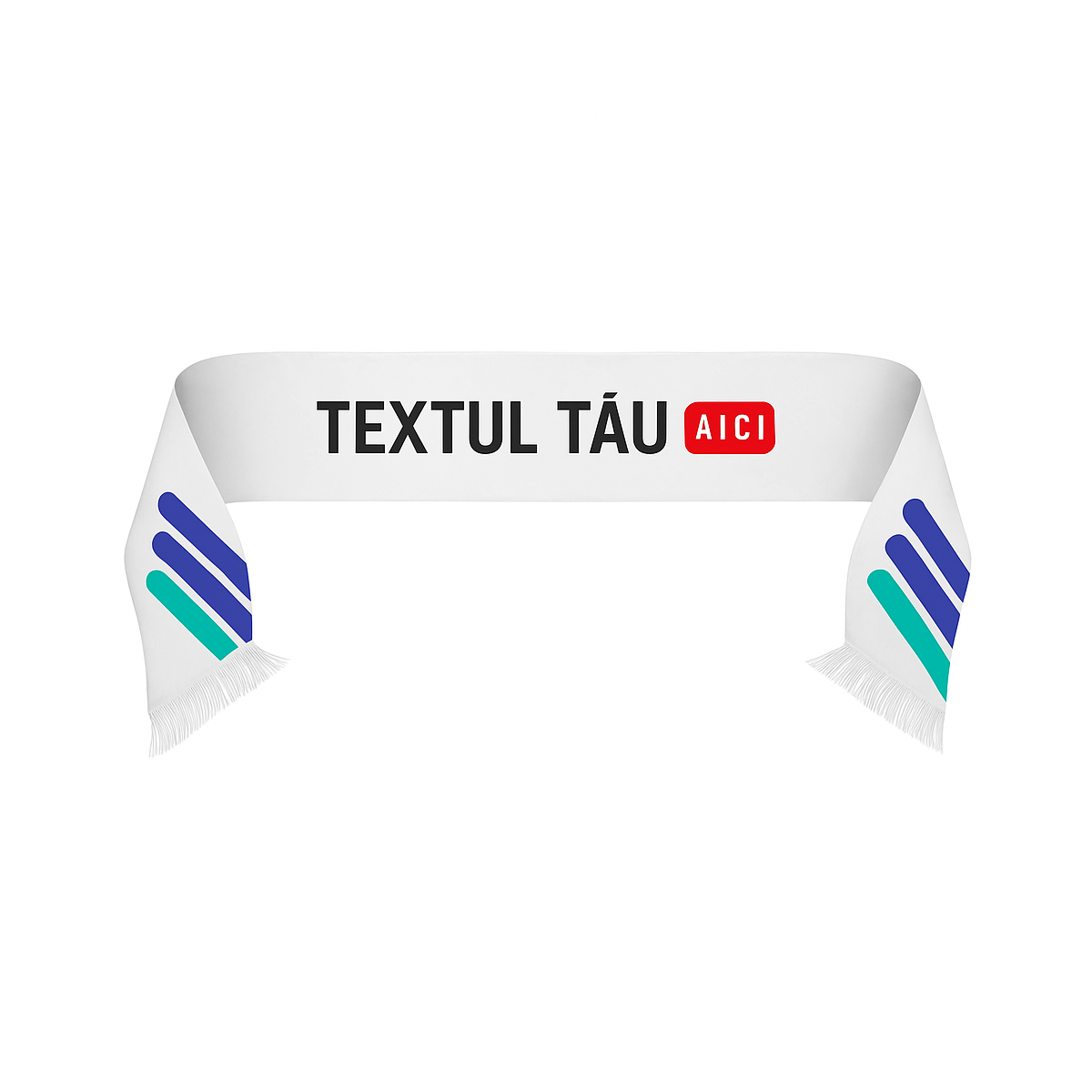 Eșarfă personalizată din material textil de calitate, ideală pentru suporteri, evenimente, concerte sau campanii promoționale. Este realizată din poliester rezistent, cu imprimare prin sublimare ce asigură culori vii și durabile în timp. Franjurile albe completează designul elegant, iar personalizarea integrală permite afișarea clară a logo-ului sau mesajului dorit.