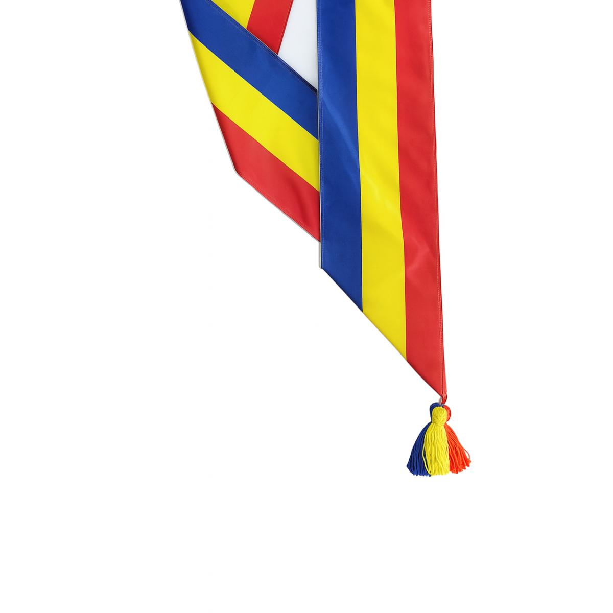 Eșarfă tricoloră cu ciucure, din material rezistent, ideală pentru ceremonii și evenimente oficiale. Culori vii și aspect elegant.