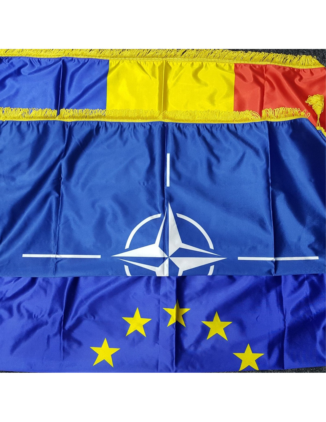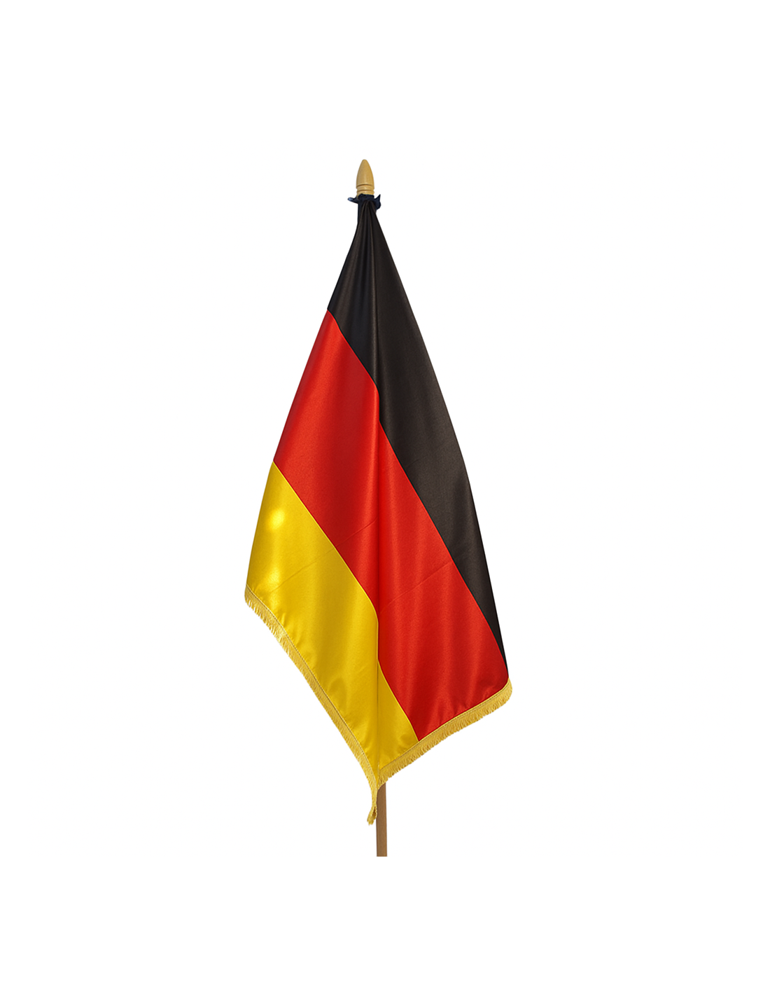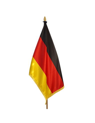 Steag Germania din satin premium, cu franjuri aurii și finisaj elegant. Ideal pentru interior, birouri, instituții și evenimente oficiale.