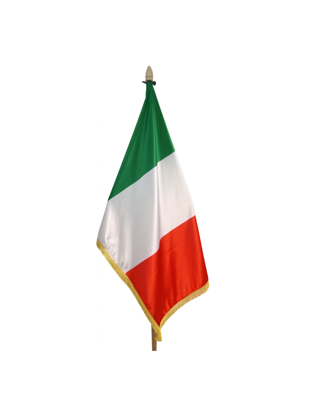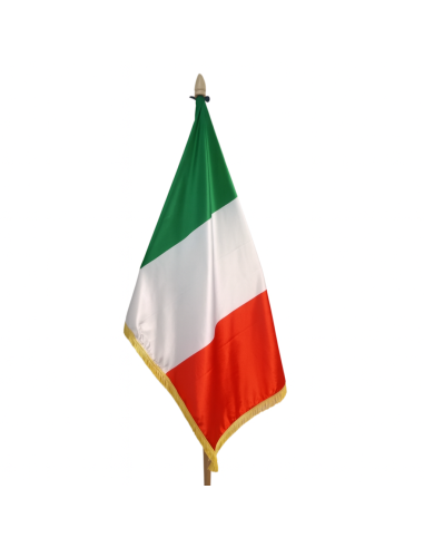 Steag Italia din satin premium, cu franjuri aurii și finisaj elegant. Ideal pentru interior, birouri, instituții și evenimente oficiale.