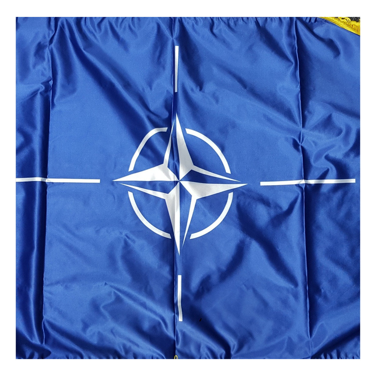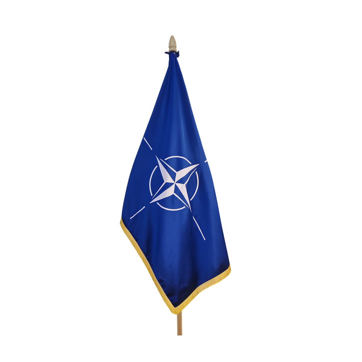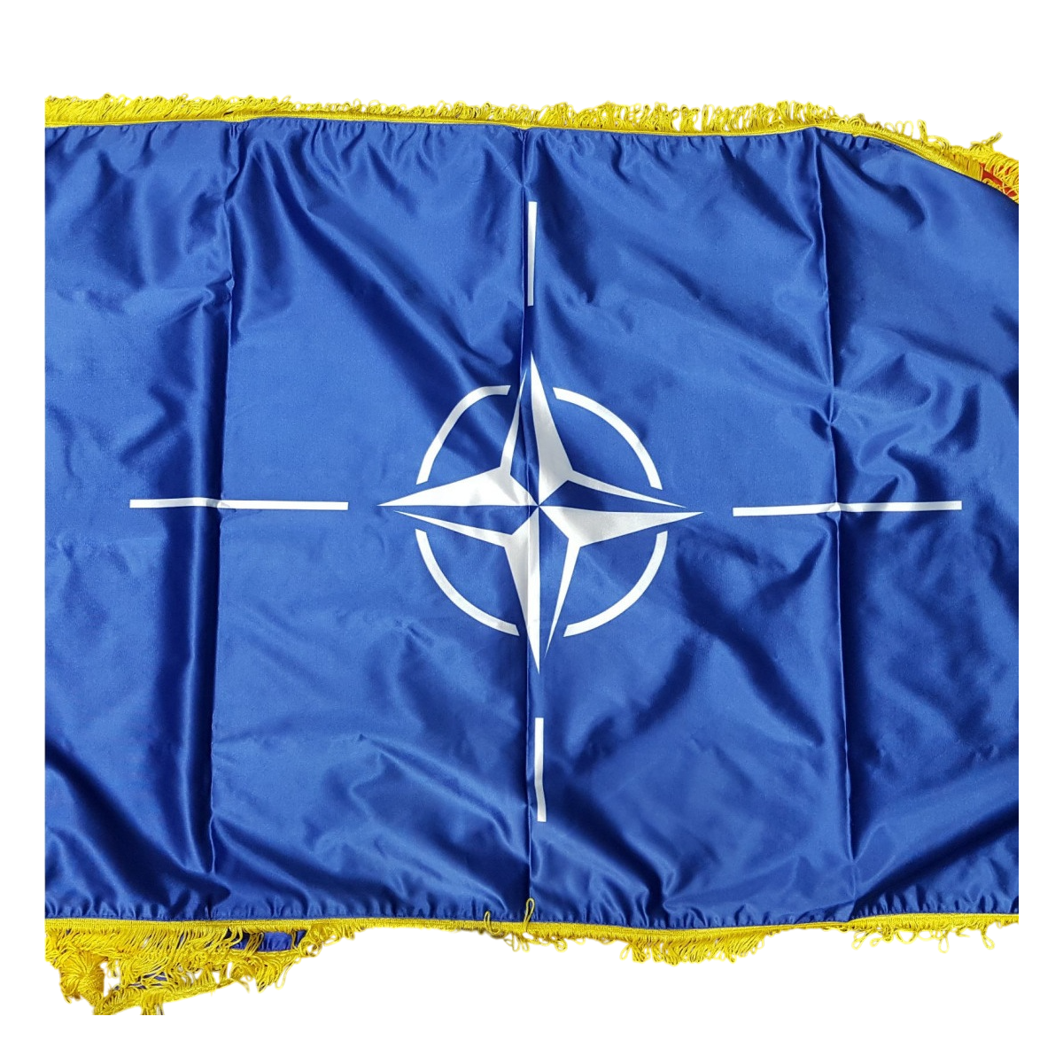 Steag NATO din satin premium, cu franjuri aurii și finisaj elegant. Ideal pentru interior, birouri, instituții și evenimente oficiale.