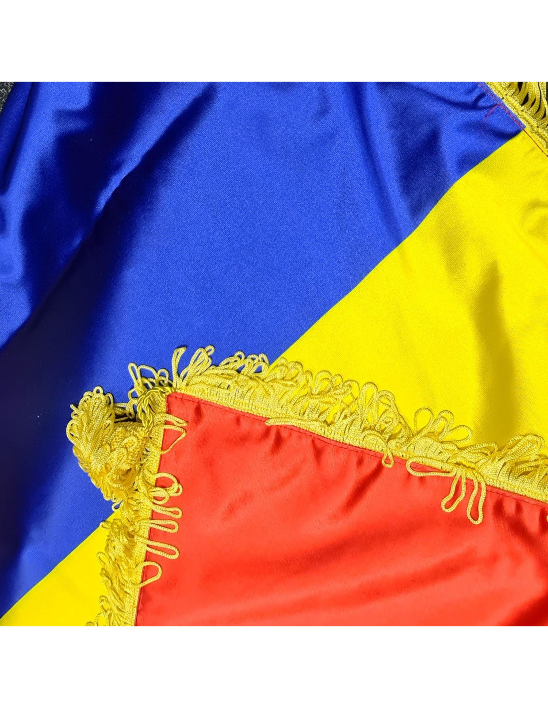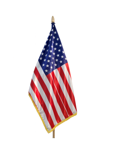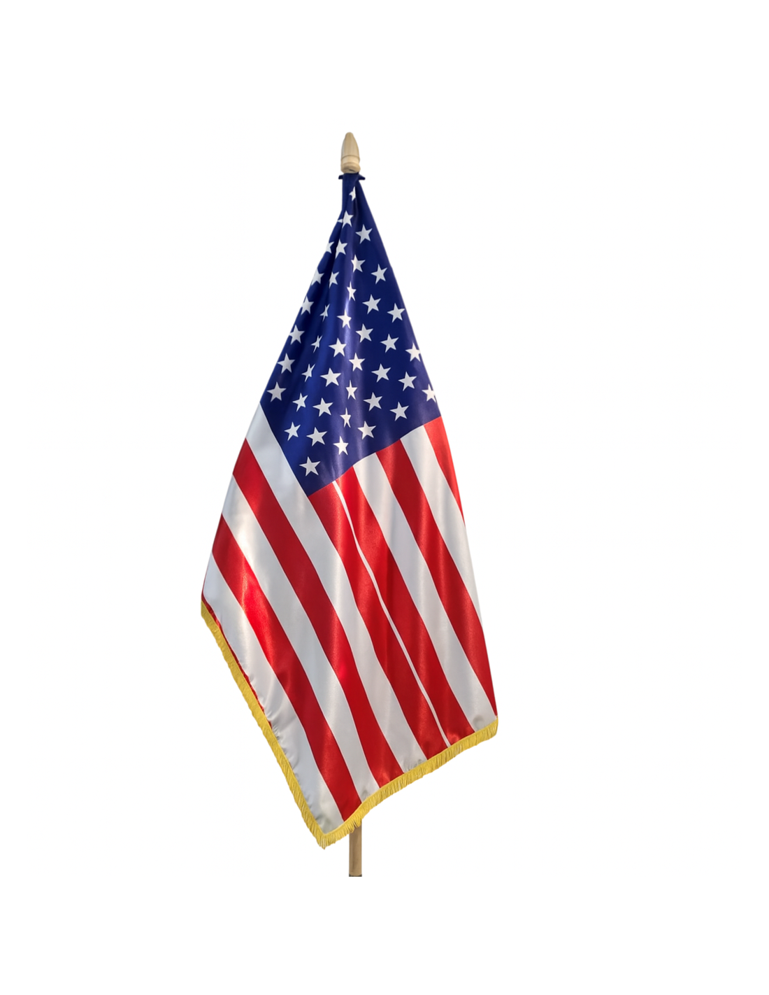 Steag SUA din satin premium, cu franjuri aurii și finisaj elegant. Ideal pentru interior, birouri, instituții și evenimente oficiale.
