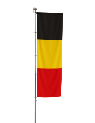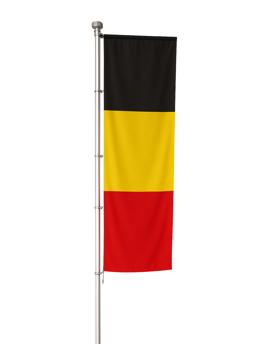 Steag vertical al Belgiei, realizat din material rezistent, cu dungi orizontale negru, galben și roșu. Ideal pentru instituții, evenimente și decor oficial.