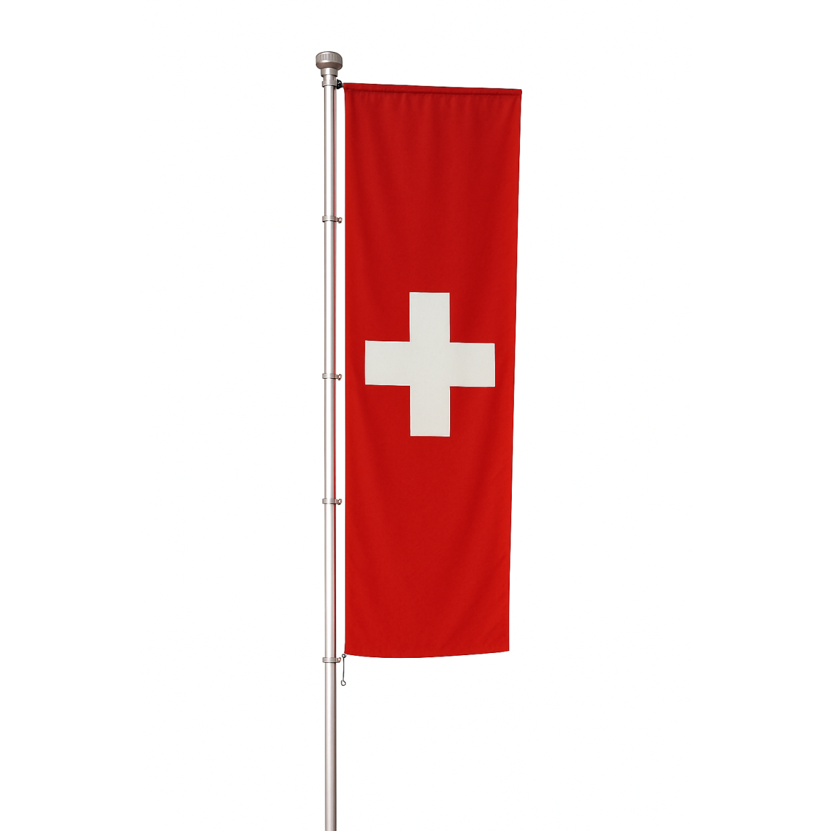 Steag vertical al Elveției, realizat din material rezistent, cu fond roșu și cruce albă centrală. Potrivit pentru instituții, evenimente și decor oficial.