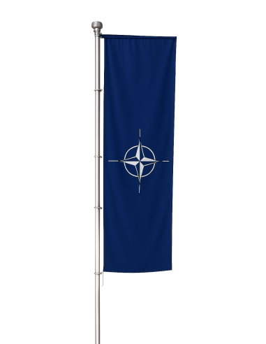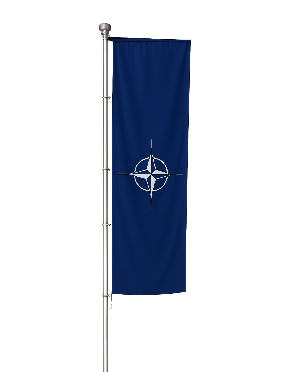 Steagul vertical NATO simbolizează unitatea și cooperarea dintre statele membre ale Alianței Nord-Atlantice. Designul său sobru și elegant include fundalul albastru și emblema albă a trandafirului vânturilor, reprezentând securitatea și orientarea comună.